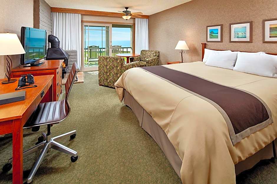 A wood-burning fireplace is offered in this guestroom.